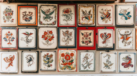 A stunning collection of vintage illustrations featuring various birds and flowers, creatively arranged on a wall. Perfect for art lovers and interior decoration ideas.