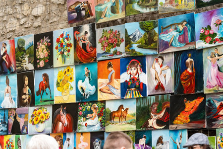 Krakow, Poland, Florianska street, lots of paintings hanging on a wall, painting reproductions, art on sale concept, large group of objects, nobody, no people