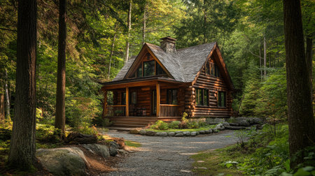 Cozy wooden cabin nestled in a serene pine forest, a tranquil retreat surrounded by nature s beauty