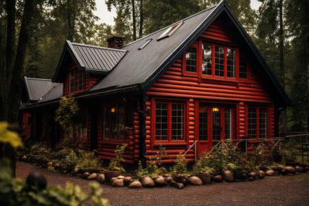 Charming wooden cabin nestled in serene forest, surrounded by vibrant autumn foliage. warm colors of leaves create cozy atmosphere, inviting tranquility and reflection