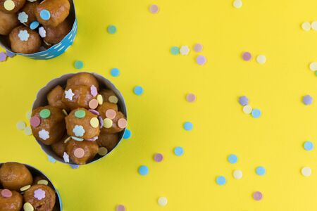 Cups filled with Struffoli, typical Neapolitan pastry consisting of many small balls of dough (realized on paper with flour, eggs, lard, sugar, anise liqueur), fried in oil and wrapped in warm honey. Decorated with colored sprinkles.