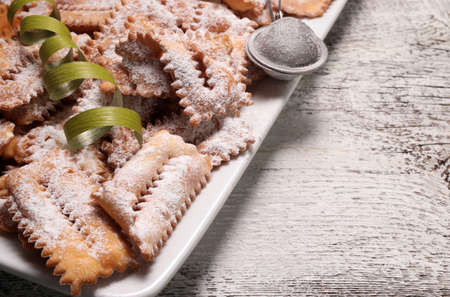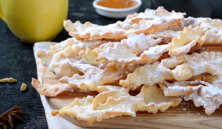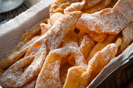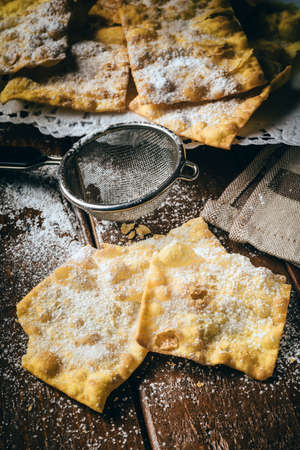 Fritters dusted with icing sugar. Frappe or chiacchiere. Traditional Italian and russian carnival food