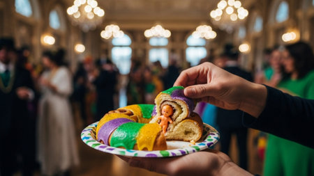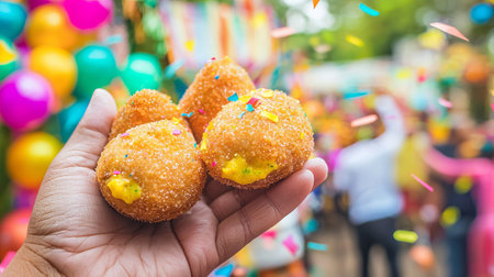 Close-up of a Hand Holding Sweet Treats at Brazilian Carnival. Concept of Festive Celebration, Colorful Street Parade, Cultural Delights, and Joyous Atmosphere.