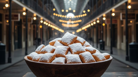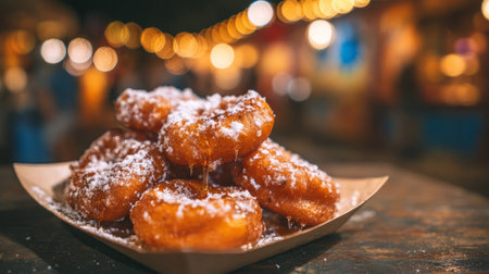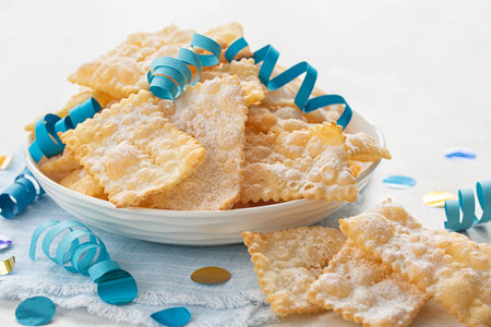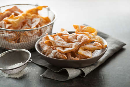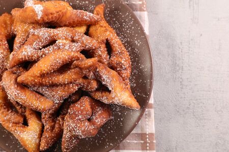 traditional polish deep fried pastry faworki with icing sugar for carnival party