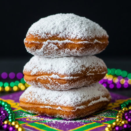 German donuts with jam and icing sugar. Carnival powdered sugar raised donuts with paper streamers.