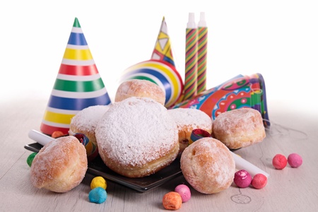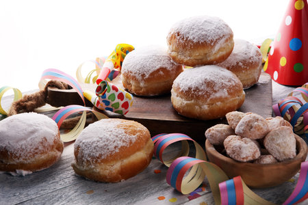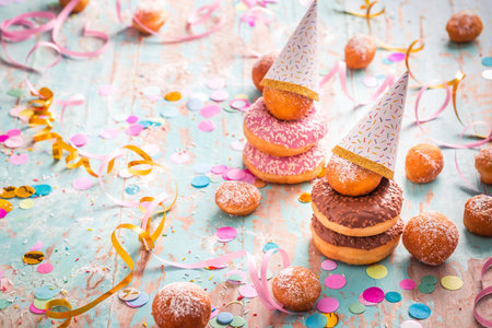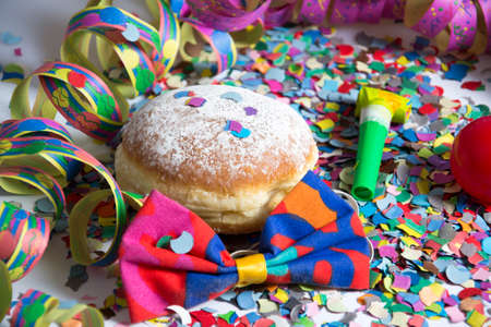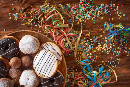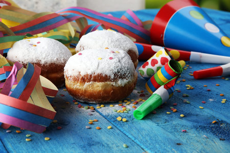 Traditional Berliner for carnival and party. German Krapfen or donuts with streamers and confetti. Colorful carnival or birthday image