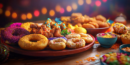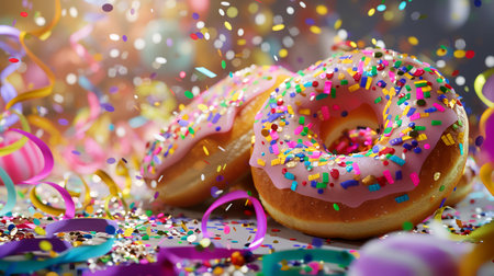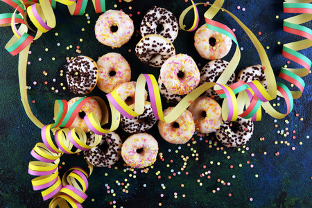 Krapfen, Berliner and donuts with streamers and confetti. Colorful carnival, birthday and Fasching image