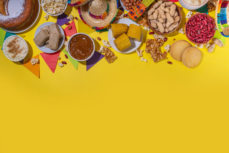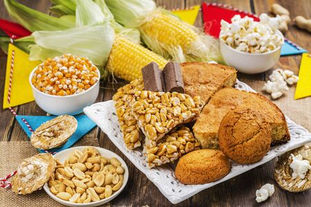 Traditional Festa Junina Summer Festival Carnival Food. Traditional Brazilian Festa Junina dishes and snacks - popcorn, peanuts, corn cake,beans, cookie, pacoca, with holiday decor and accessories