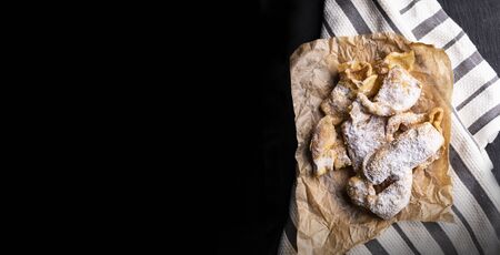 Italian Frappe or chiacchiere - typical Italian carnival fritters dusted with powdered sugar on old black wooden table. With free text space.