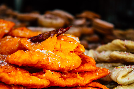 Kathmandu Nepal September 1, 2018 Closeup of Nepalese street food sold in Thamel district in Kathmandu in the morning