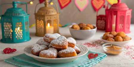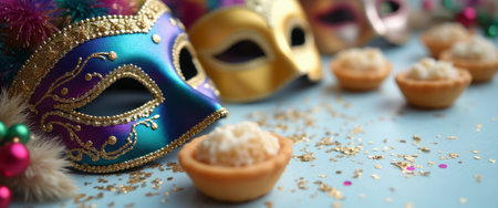 A plate of homemade donuts and a cup of coffee on carnival party table with venetian mask and ornaments in blue and golden colors