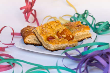 Coca de Sant Joan, a traditional sweet cake from Catalonia, Spain. It is eaten during Saint Johns Eve.