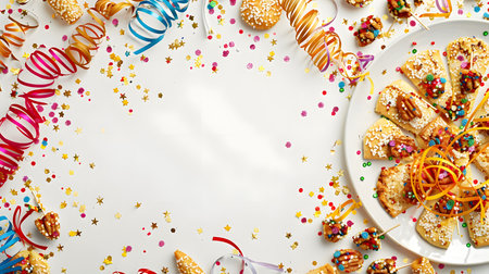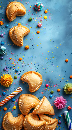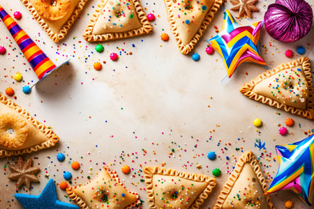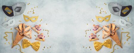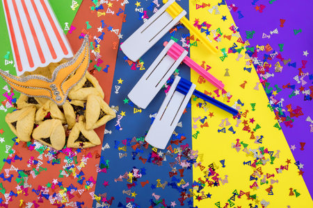 Purim, jewish carnival holiday celebration background. Top view, flat lay