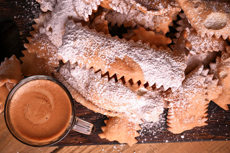 Carnival food TYPICAL and aromatic coffee on a woody background. Sfrappole or chiachiere or angel wings. Traditional sweet crisp pastry deep-fried and sprinkled with powdered sugar. Above