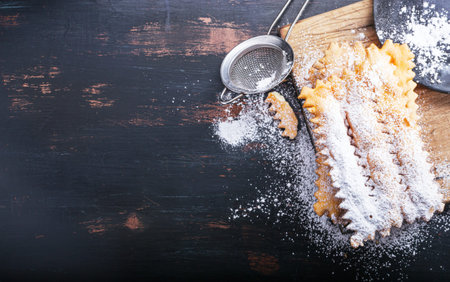 Homemade traditional Italian carnival sweets: chat on dark background. Copy space. Directly above.