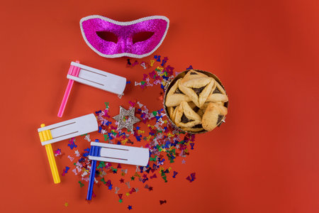 Jewish carnival Purim celebration on hamantaschen cookies, noisemaker and mask with Top view from above.