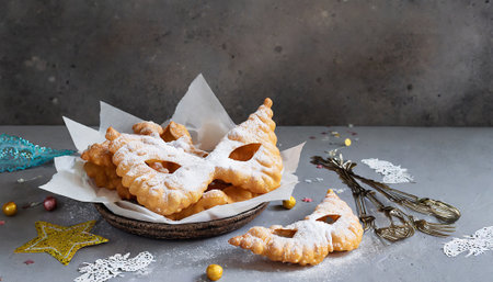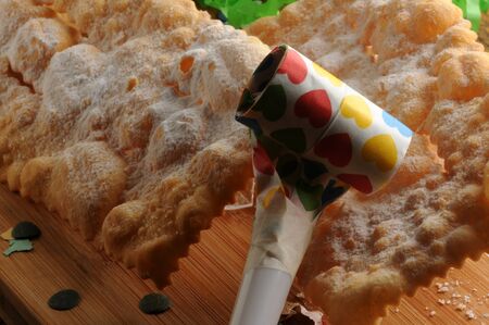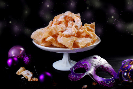 Carnival mask shape Angel wings or sfrappole or chiacchiere. Traditional sweet crisp pastry deep-fried and sprinkled with powdered sugar. Italian carnival food tradition. Decorated with paper serpentine.