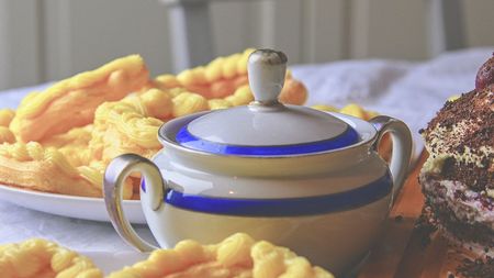 Brushwood - crispy deep fried cookies in powdered sugar with tea and jam. A traditional treat at European festivals.