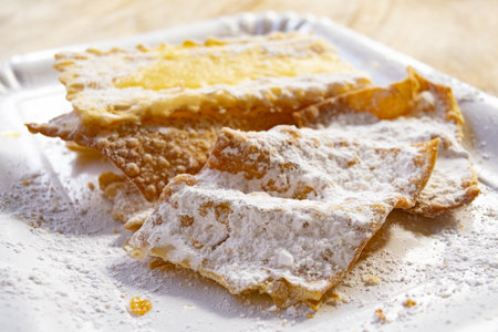 Frappe or chiachiere or angel wings are a traditional sweet crisp pastry deep-fried and sprinkled with powdered sugar. Carnival food tradition.