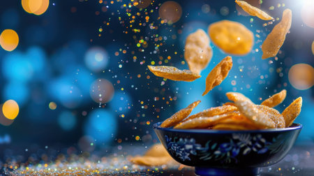 Sfrappole or chiachiere or angel wings on a bright blue background. Italian Carnival and TYPICAL food. Traditional sweet crisp pastry deep-fried and sprinkled . Copy space