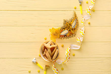 Carnival mask and Hamantaschen cookies for Purim holiday with party blowers on color wooden background
