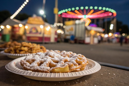 Carnival theme food table scene over a dark wood banner background. Above view. Summer fair concept. Corn dogs, funnel cake, cotton candy and snacks.