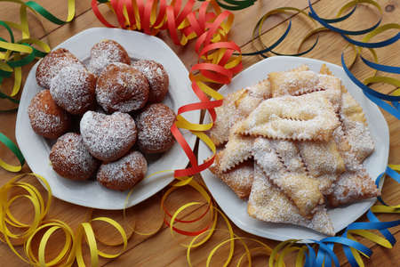 Traditional italian Crostoli (also called chiacchere, frappe, bugie, cenci, galani) and fritters called Frittelle with cream on wooden table with Confetti and coloful Carnival decorations
