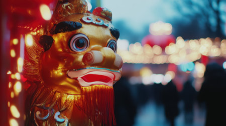 A vibrant golden lion statue stands brightly lit at a lively night market during a cultural celebration surrounded by festive lights and crowds.
