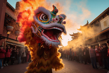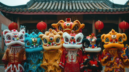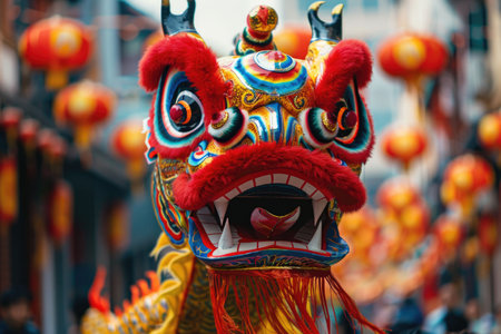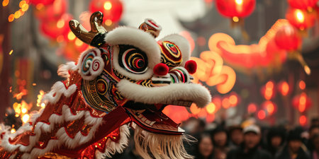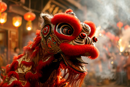 Vibrant Chinese lion dance takes center stage in this festive celebration, with intricate costumes and a backdrop adorned with red lanterns.