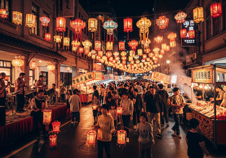 Joyful celebration at a lantern festival with vibrant colors and cheerful participants in traditional outfits