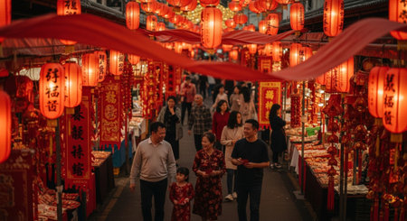 People shopping at vibrant Chinese New Year market decorated with lanterns and red colors Lunar Street Market