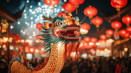 Thriving Night Celebration Colorful Lanterns and Dragon Decorations Illuminate Festive Ambiance