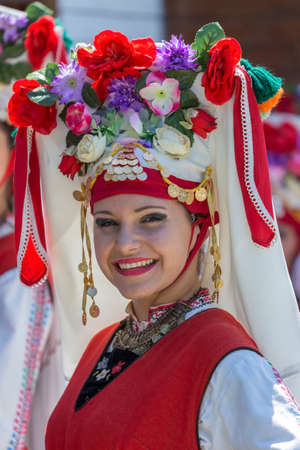 TIMISOARA, ROMANIA - JULY 9, 2017: Portrait of dancer girl from Bulgaria in traditional costume present at the international folk festival