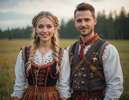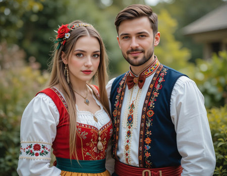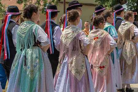 Anonymous young people in folklore costumes