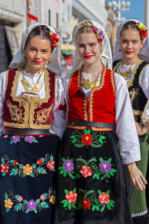 TIMISOARA, ROMANIA - SEPTEMBER 22, 2019: Young dancers women from Serbia in traditional costume present at the Festival of Ethnic Minorities, organized by the City Hall.