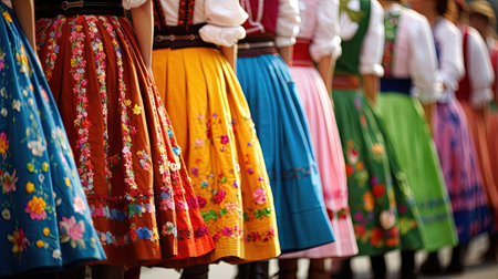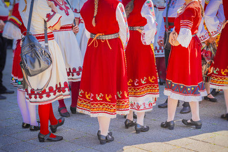 Group of unrecognizable women dressed in bright traditional Bulgarian folk costumes with colorful patterns and embroidery