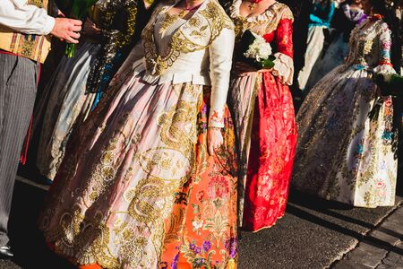 Women falleras with their traditional Valencian traditional costumes walking through the colorful streets of the city of Valencia.