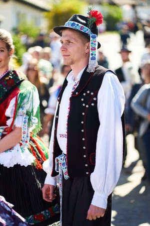 Portrait of a young man dressed in a traditional folk costume in Holloko village, Hungary