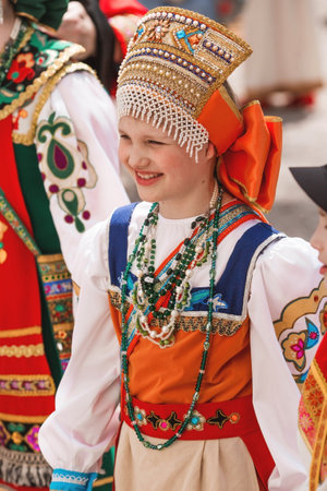 Russian folk traditions. folk festivals. Children in beautiful Russian traditional outfits sing songs, dance and lead a round dance in Tsaritsyno Park. National Russian clothing. Sundresses and kokoshniks.