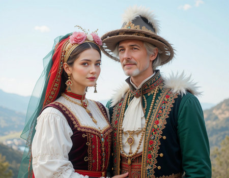 Portrait of a young couple wearing traditional costume in the mountains.