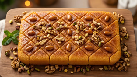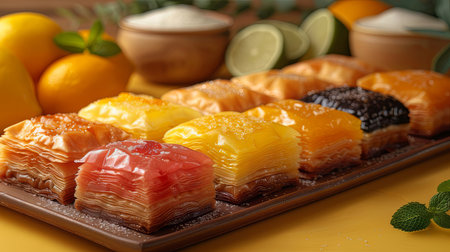 An enticing variety of baklava, featuring layers of phyllo pastry, honey, and assorted nuts on a wooden tray, accentuated by fresh citrus and mint.