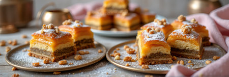 Delicious walnut baklava squares with honey and powdered sugar. That the image is generated using AI.