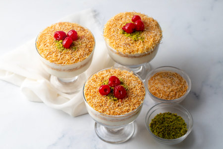 Traditional milky crispy Ramadan dessert custard pudding with roasted kadayif and diced pistachio. Kadayifi Pudding