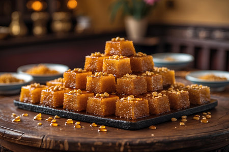 Honeycomb dessert with caramelized sugar on a wooden background.