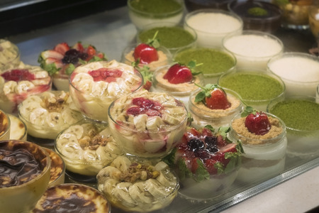 Different sweet cakes in bakery cafe close up. Confectionery cakes in candy shop