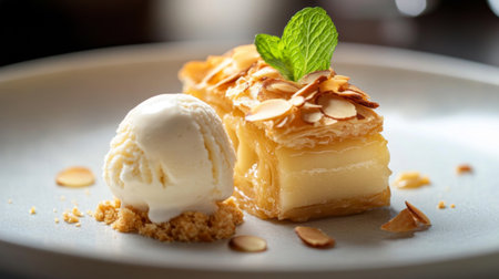 A close-up of a pear and almond strudel, with golden pastry and almond flakes on top, served alongside a scoop of vanilla ice cream and garnished with fresh mint leaves.