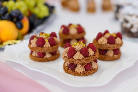 AI Generated. Delicious miniature cakes with raspberries and whipped cream are displayed