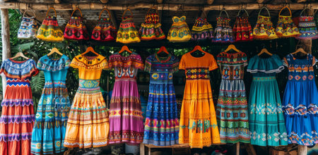 A row of traditional Mexican dresses, known as vestidos, hang on wooden hangers in a market setting, showcasing vibrant colors and intricate embroidery.