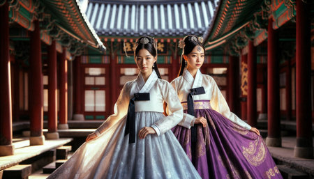 two Beautiful women posing gracefully in traditional Korean hanbok decorated with delicate embroidery