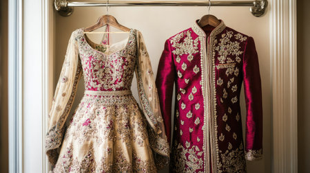 Beautifully crafted traditional attire displayed elegantly on hangers. The intricate embroidery and rich colors capture the essence of cultural heritage and celebration.